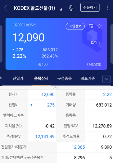 KODEX 골드선물의 순자산가치인 NAV (Net Asset Value) 와 실재 매매되는 시장거래가격간의 차이를 괴리율이라고 합니다.
